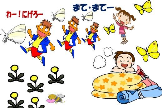 チョウさんもお仕事たいへんね。 この少年逃げてばかりね(笑)この少年の名はマー坊よ。