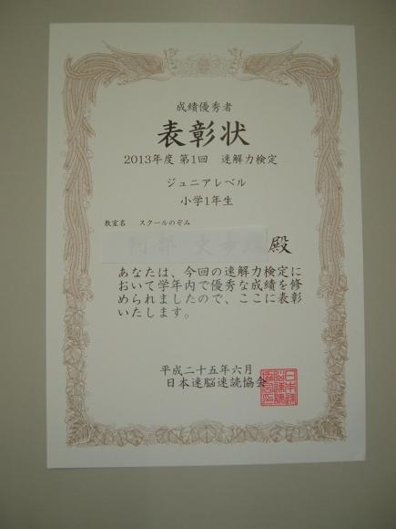 第1回速読速解力検定ジュニア部門で小1しほりちゃんが優秀賞に輝きました。