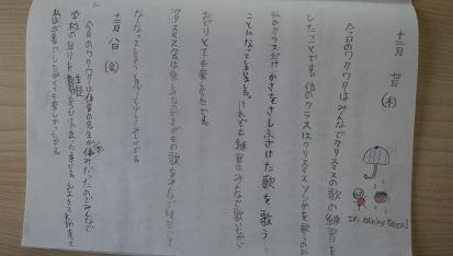 今日のワクワクはみんなでクリスマスの歌の練習をしたことです。他のクラスはクリスマスソングを歌うのに私のクラスだけ かさをさしふざけた歌を歌うことになってしまいました。けれども練習はみんなで歌いながらおどりとても楽しかったです。クリスマス会は楽しみなのですがその歌をみんなで練習できなくなってしまうと思うと少しさみしいです。