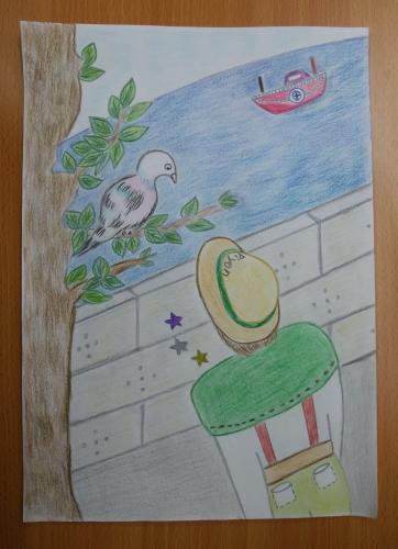Poppo flew and sat on the boy’s hat,