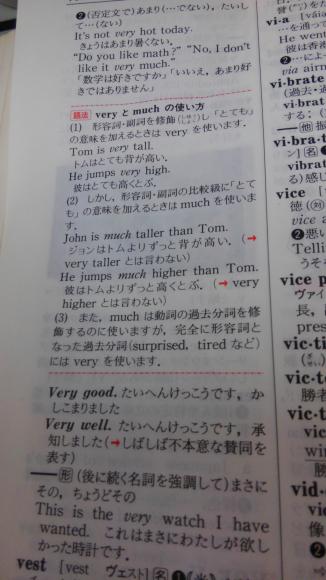 こんにちは。 学習塾「あっぷ指導会」の大波多です。 皆さんの今年の初夢は何でしたか? 私の初夢は、仕事をしている夢でした(笑)。 辞書の選び方を、生徒さんに説明している夢。 職業病ですね。 今日のブログは、辞書の選び方について。 英語の辞書の選び方についてお話します。 まず小学6年生の終わりに、英語の辞書を購入 するかと思います。 中学3年間使用するもので、厚さとしては 2センチぐらいのものです。 「very(とても)」という単語を引いてみました。 中学生では、主に副詞の意味で問われることが 多いです。 また、「語法」にありますように、「very」と 「much」の違いも問われます。 それでは高校英語になるとどうでしょうか? 高校英語の辞書は、厚さ4センチ程度の ものになります。 中学生の頃にしようしていたものの2倍になります。 高校英語になると、副詞の「とても」という 意味が問われることが少なく、センターなどでは 形容詞の「まさにその」の意味の方が問われます。 つまり、中学と高校では、単語量が増えることは もちろん、一つの単語でも複数意味があり、 高校英語では複数の意味が問われることになります。 「それであれば、中学から厚い辞書を持たせたら?」 と思うなかれ。 文字数が増えるにつれ、辞書を引く時間と手間が 増えてしまうのです。 手がかかるし、お金もかかりますが、やはり 中学と高校で別々の辞書を用意するほうが 良いということなのです。 こんな夢を見てしまいました・・・。 「あっぷ病」です(笑)。 【3学期の授業】 1/9(祝月)よりはじまります。 祝日ですが、個別、集団、速読コースともに 授業はあります。 江戸川区船堀の進学塾(学習塾あっぷ指導会) 中学受験・高校受験・大学受験の学習塾 「あっぷ指導会」 江戸川区・船堀校(個別・集団進学塾) 03-6240-5420 都営新宿線船堀駅 徒歩45秒 江戸川区船堀3-7-17第5トヨダビル5F (ハローワークさんが目印です) 江戸川区西葛西の進学塾(学習塾あっぷ指導会) 中学受験・高校受験・大学受験の学習塾 「あっぷ指導会」江戸川区・西葛西(個別・集団進学塾) 03-5696-1501 東西線西葛西駅 徒歩30秒 江戸川区西葛西3-15-16 アイリス3F (1階に焼肉屋さんが入っているビルです)