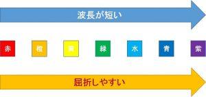 それぞれの色の波長の違いと、屈折のしやすさを表したのが下の画像です。