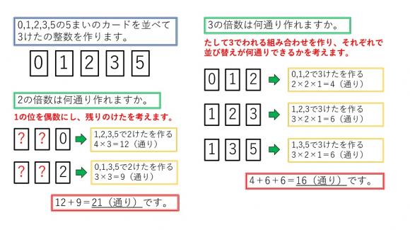 何枚かのカードを並べてできる整数の中で、「3の倍数は何通りできますか」などの問題が出題される定番のパターンです。