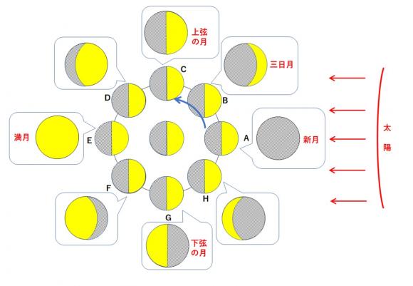 太陽との位置関係から月の形が分かります。