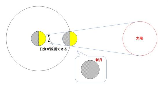 地球と太陽の間に月があるときに日食が起こります(新月の位置関係)。