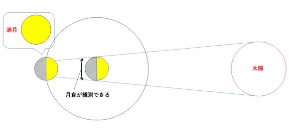 月、地球、太陽という位置関係のときに月食が起こります(満月の位置関係)。