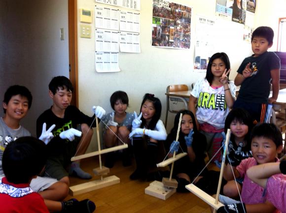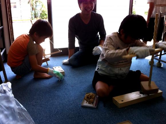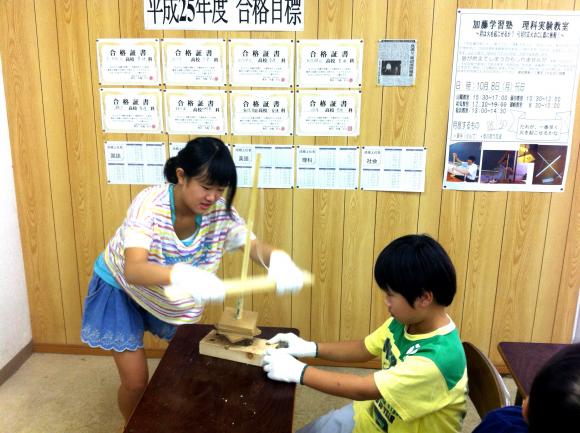 理科実験教室を実施しました 〜君は火を起こせるか? 弓切り式火おこし器に挑戦!〜 当日は、弓切り式火おこし器の組み立てからということで案内しておりましたが、時間の都合で、火おこしの活動のみになってしまいました。しかし、どの教室においても、どの生徒も火を起こそうと一生懸命で、汗をいっぱいかきながら火おこし器を動かしていました。残念ながら、今回の理科実験教室では火を起こすということはできなかったのですが、弓切り式火おこし器を差し込んであった下の木材の穴の中は黒く焦げ、煙が出るというところまではいくことができました。ただ、火おこしが初めての経験であるという生徒は、それだけでも十分に感動していたように思います。特に、藤田教室や、和気教室では煙が教室の中にもうもうと充満するという状態にまでなりました。もう少し頑張ればモグサに着火できるかなとは思ったのですが・・・。煙が出るようになるまでにも少し時間がかかる上に、そのころから摩擦が大きくなるようで、火おこし器を動かすのが一段と大変になります。結局着火までこぎ着ける前に回している人間が疲れ切ってしまうという状態でした。各教室をまわった講師陣も腕がぱんぱんになり、筋肉痛で次の日の授業が大変という状況になってしまいました。 ←クリック!←クリック! しかし、何でも実際にやってみることが本当に大事なんだなということを感じたのは、実際に活動していく中で、生徒や保護者の中から一番下の重りの重さがもう少し必要ではないのかとか、今回はその部分が四角の形をしていたので風が起こって温度がなかなか上がらないのではというような意見が飛び出していたということです。これは実際にやってみないと分からないことです。これは次に機会があれば活かしたいと思いますが、ただ理屈を知っているだけではなく、本当に経験してみる中で分かること、発見することが出てくるのだということがよくわかります。 ←クリック!←クリック! さて、さらに生徒のみなさんに話しておきたいことは、あることを成し遂げようと思うと本当に苦労が必要なのだということです。ただ単に火を起こすということだけでも、こんなに大変なんです。つまり、それは勉強でも同じです。苦労を乗り越えることなく高い目標を達成できるということはありません。今回の経験を、勉強面でも活かして欲しいと思います。またその一方で、確かに今ではマッチやライターがあれば簡単に火は付けられます。でも、このことは次のようにも考えられます。今の便利な生活は、先人が勉学そして研究に励み、多くの発明をしてきたからです。その恩恵をうけて、自分たちは今日の便利な生活ができているのです。先人の努力に感謝し、先人に続きさらに便利な世の中を創っていくのはみなさんです。そのためには、今しっかりと勉強して、社会の中や自然の中にある、多くの仕組みや事実を知っていくことが大事なのです。