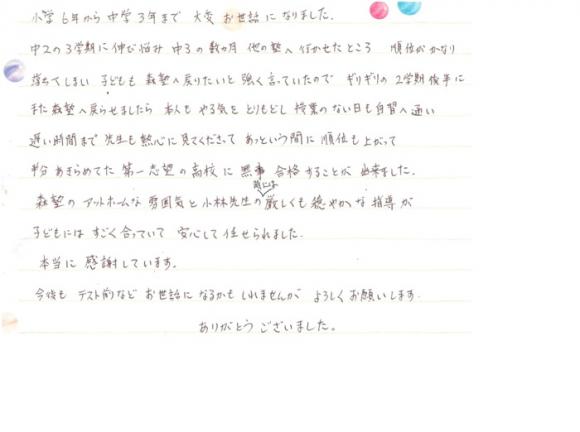 中2の3学期に伸び悩み、中3の数カ月、他の塾へ行かせたところ順位がかなり落ちてしまい、子どもも森塾へ戻りたいと強く言っていたので、ギリギリの2学期後半に、また森塾へ戻らせましたら本人もやる気をとりもどし、授業のない日も自習へ通い、遅い時間まで先生も熱心に見てくださって、あっという間に順位も上がって半分あきらめていた第一志望の高校に無事合格することができました。森塾のアットホームな雰囲気と小林先生の時には厳しくも穏やかな指導が子どもにはすごく合っていて、安心して任せられました。本当に感謝しています。今後もテスト前などお世話になるかもしれませんが、よろしくお願いします。