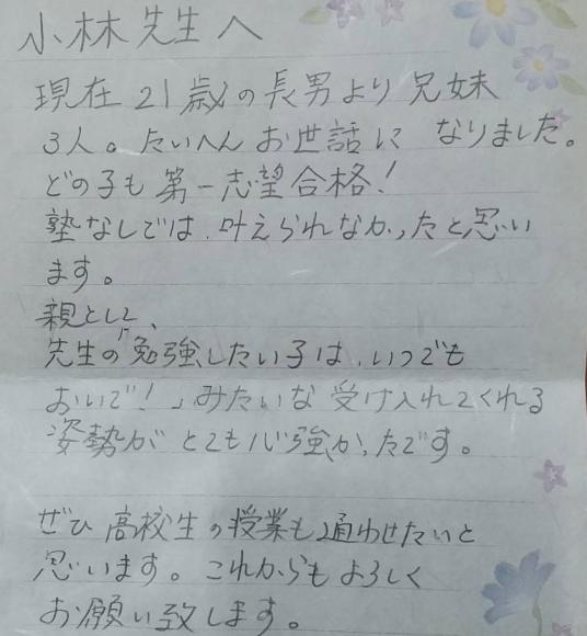 現在、21歳の長男より兄妹3人。たいへんお世話になりました。どの子も第一志望合格!塾なしでは考えられなかったと思います。親として、先生の「勉強したい子は、いつでもおいで!」みたいな受け入れてくれる姿勢がとても心強かったです。ぜひ高校生の授業も通わせたいと思います。これからもよろしくお願い致します。