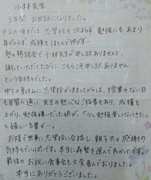 お陰で無事に志望校に合格し、親子共々感謝の気持ちでいっぱいです本当に森塾を選んで良かったです。最後のお祝い食事会も大変喜んでおりました。本当にありがとうございました。