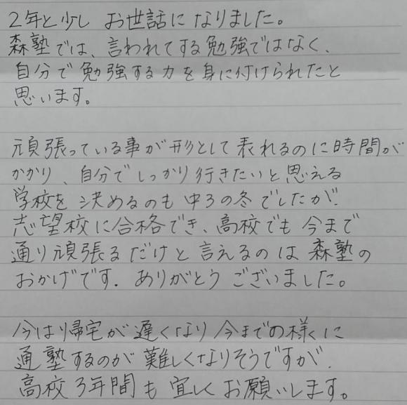 2年と少しお世話になりました。 森塾では言われてする勉強ではなく、自分で勉強する力を身に付けられたと思います。 頑張っていることがはっきりと形として表れるのに時間がかかり、自分でしっかり行きたいと思える学校を決めるのも中3の冬でしたが、志望校に合格でき、高校でも今まで通り頑張るだけと言えるのは森塾のおかげです。ありがとうございました。 今は帰宅が遅くなり今までの様に通塾するのが難しくなりそうですが、高校3年間も宜しくお願いします。