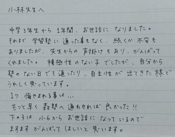 小林先生へ 中学3年生から1年間お世話になりました。それまで学習塾に通った事もなく、続くか不安もありましたが、先生からの声掛けもあり、がんばってくれました。積極性のない子でしたが、自分から塾のない日でも通ったり、自主性が出てきたようでうれしく思っています。 1つ悔やまれることは・・・ もっと早く森塾へ通わせればよかった!!下の子は小6からお世話になっているので、ますますがんばってほしいと思います。
