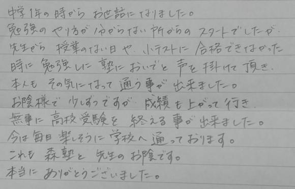 中学1年の時からお世話になりました。 勉強のやり方が分からないところからのスタートでしたが、先生から授業のない日や小テストに合格できなかった時に勉強しに塾においでと声を掛けて頂き、本人もその気になって通うことができました。 おかげ様で少しずつですが成績も上がっていき、無事に高校受験を終えることができました。今は毎日楽しそうに学校へ通っております。これも森塾と先生のお陰です。本当にありがとうございました。