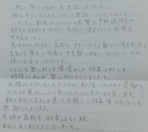 具体的に行きたい高校が決まってから入塾させて頂きました。先生の丁寧なご指導と大手塾にはないフレンドリーさが娘には合っていたようです。