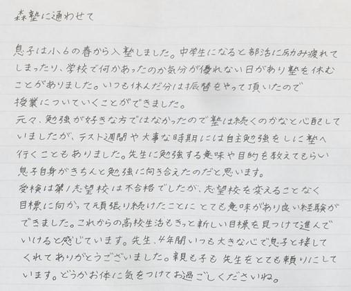 受験は第一志望校は不合格でしたが、志望校を変えることなく目標に向かって頑張り続けたことにとても意味があり良い経験ができました。これからの高校生活もきっと新しい目標を見つけて進んでいけると感じています。先生、4年間いつも大きな心で息子と接してくれてありがとうございました。親も子も先生を頼りにしています。どうかお体に気をつけてお過ごしくださいね。