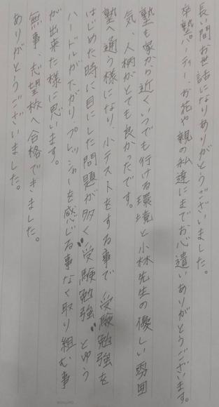 長い間お世話になりありがとうございました。 卒塾パーティ、お花や親の私たちにまでお心遣いありがとうございます。 塾も家から近くいつでも行ける環境と小林先生の優しい雰囲気、人柄がとても良かったです。 塾へ通うようになり、テストをすることで、受験勉強をはじめた時に目にした問題が多く「受験勉強」というハードルが下がりプレッシャーを感じることなく取り組むことができたように思います。 無事志望校へ合格できました。 ありがとうございました。
