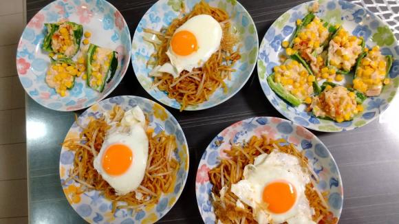 今日の夜ごはんは焼きそばと、ピーマンのマヨコーンシーチキン詰め