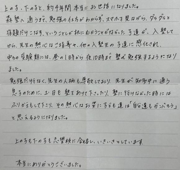 森塾へ通うまで、勉強の仕方がわからず、スマホを見ながらダラダラと宿題だけこなす、ということしか机に向かうことがなかった子達が、、入塾してから先生の熱心なご指導や、他の入塾生の子達に感化され、中3の受験期には、昼の1時から夜10時まで塾で勉強するようになりました。