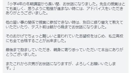 「小学4年の冬期講習から長い間、お世話になりました。先生の授業はとても楽しく、思うように勉強が進まない時には、アドバイスをいただきありがとうございました。 他の習い事の関係で授業に参加できない時は、別日に振り替えて教えていただいたり、テスト前は朝から晩までお世話になりました。 そのおかげでちょっと難しいと言われていた志望校をはじめ、私立高校にも全て合格することができました。 またこれから次男がお世話になりますが、よろしくお願いいたします。」