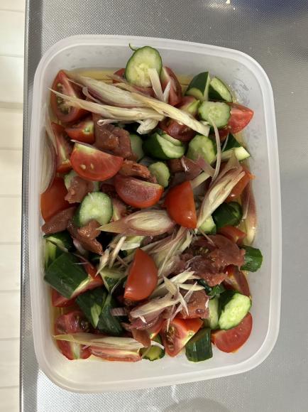 きゅうり・トマト・うめぼし・みょうがを、塩・みりん・醤油でつけたもの