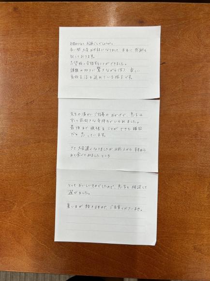 お変わりなくお過ごしでしょうか。 長い間大変お世話になりまして、本当に感謝を致しております。 志望校へ合格することができました。 課題の多さに驚きながら(笑)楽しい高校生活を送れている様子です。 先生の温かいご指導のおかげで、息子はずっと前向きな気持ちでいられました。最後まで頑張ることができた勝因だと思っています。 さて、大変遅くなりましたが以前人からすすめられて食べてみましたところとてもおいしいものでしたので、息子と相談して選びました。 暑い日が続きますので、ご自愛くださいませ。