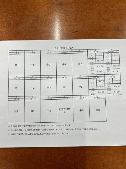 2023年10月30日 月曜日 テスト前の予定 ( 教室からのお知らせ )