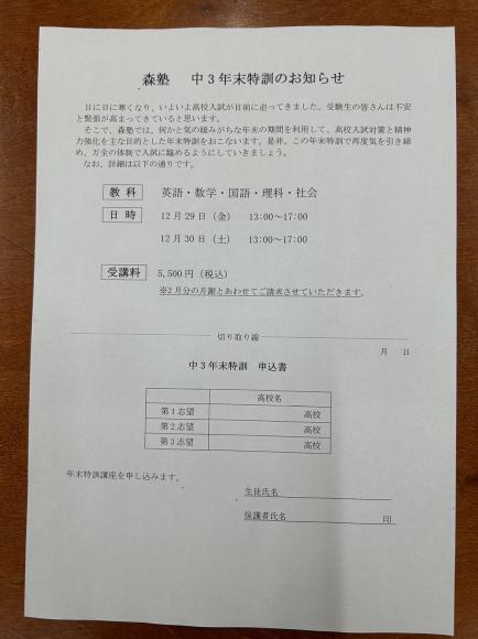 2023年12月30日 土曜日 中3 年末特訓 ( 教室からのお知らせ )