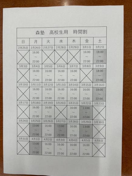 高校生用の予定表です。 中3も高校生として、この時間に来てもいいよ😊 受験は終わったけど、まだまだ勉強は終わらないからね! 中1・2はそろそろ順位が出てくるころかな? 楽しみにしてるよ! 今日も待ってるよ〜