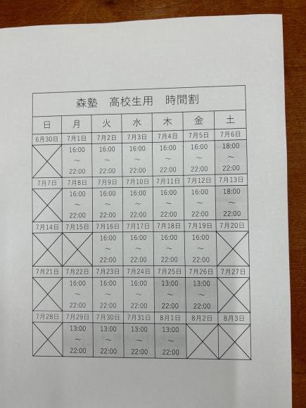 高校生用の時間割 日によって、時間が違うし、休みの日もあるからよく見てね😊 暑い夏は涼しい森塾でたくさん勉強しようね🔥 今日も待ってるよ〜