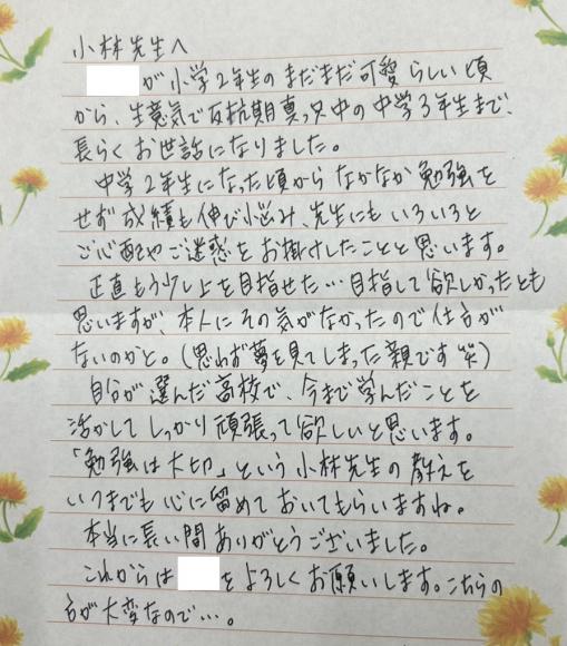 中学2年生になった頃からなかなか勉強をせず成績も伸び悩み、先生にもいろいろとご心配やご迷惑をお掛けしたことと思います。