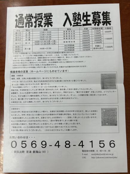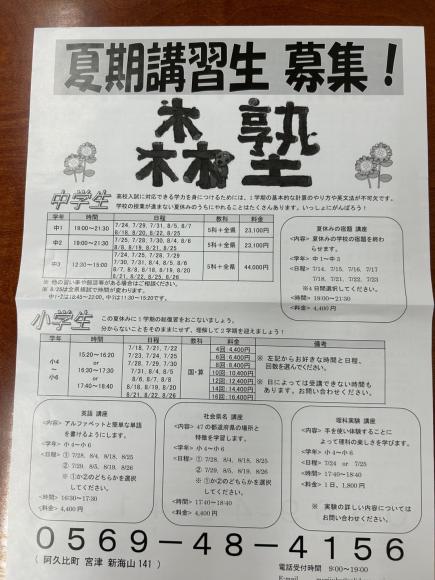 夏期講習のチラシです☺️ だいぶ前に出来上がったのに、お知らせにあげるの忘れてた… ということで、もうすぐ夏期講習🔥 暑い夏は、森塾でず〜っと過ごそうね☺️ 今日も待ってるよ〜