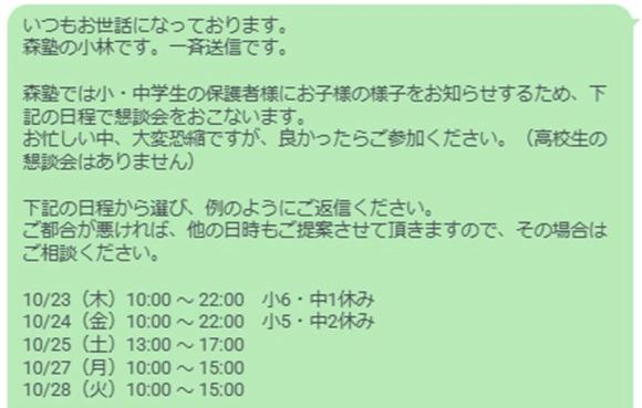 10/21 以前に保護者様へ送信したLINEです☺️ 23(木)から懇談会をおこないます。 多数のご参加ありがとうございます! 23(木)と24(金)の授業はございませんので、よろしくお願いいたします。 今日も待ってるよ〜