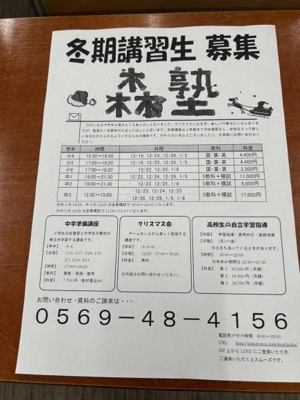 冬期講習のチラシができました☺️ 定期テストが終わったと思ったら…冬期講習… 冬休みは楽しい行事は多いけど、勉強もしないとね! 今日も待ってるよ〜