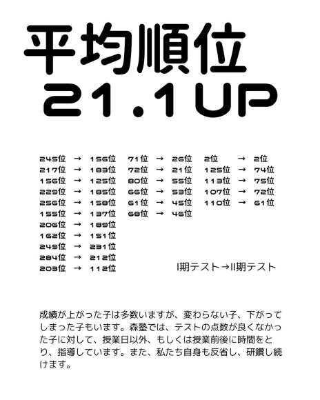 定期テストの結果がある程度でました!😊 (インフルエンザなどで休んでいて、まだ順位が分からない子もいます) 平均すると、20番以上あがりました😊 みんな頑張ったね💪 もちろん、全員があがったわけではありません… 私の力不足で申し訳ないです🙇 授業前後、授業日以外もたくさん来て、次のテストに備えようね🔥 今日も待ってるよ〜