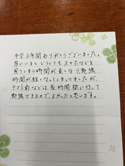 中学三年間ありがとうございました。 家にいるとどうしてもスマホなどを見てしまう時間が長くなり、勉強時間が短くなってしまってましたが、テスト前などは長時間塾に行って勉強できるので、良かったと思います。