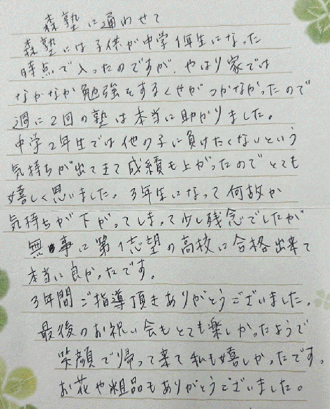 中学2年生では他の子に負けたくないという気持ちが出てきて成績も上がったので、とても嬉しく思いました。3年生になって何故か気持ちが下がってしまって少し残念でしたが、無事に第一志望の高校に合格できて本当に良かったです。3年間ご指導いただきありがとうございました。