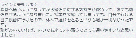 ラインで失礼します。 森塾へ通うようになってから勉強に対する気持ちが変わって、家でも勉強をするようになりました。授業を欠席してしまっても、自分の行ける日に振替に行けたので、休んで後れを取るという心配が一切なかったです。 塾があいていれば、いつでも来ていい感じでとても通いやすいなと思いました!