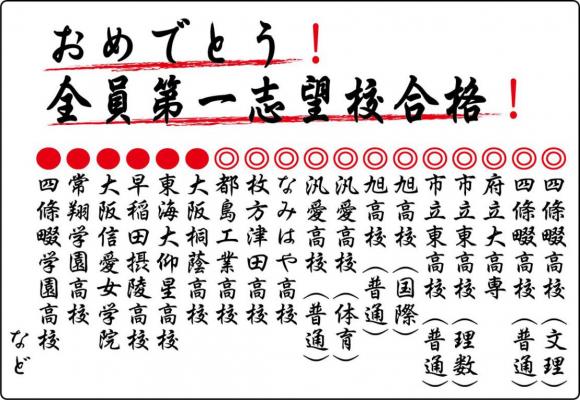 ◎四條畷高校(文理) ◎四條畷高校(普通) ◎府立大高専 ◎市立東高校(理数) ◎市立東高校(普通) ◎旭高校(国際) ◎旭高校(普通) ◎汎愛高校(体育) ◎汎愛高校(普通) ◎なみはや高校 ◎枚方津田高校 ◎都島工業高校 ●大阪桐蔭高校 ●東海大仰星高校 ●早稲田摂陵高校 ●大阪信愛女学院 ●常翔学園高校 ●四條畷学園高校 など 後輩たちもあとに続こう!