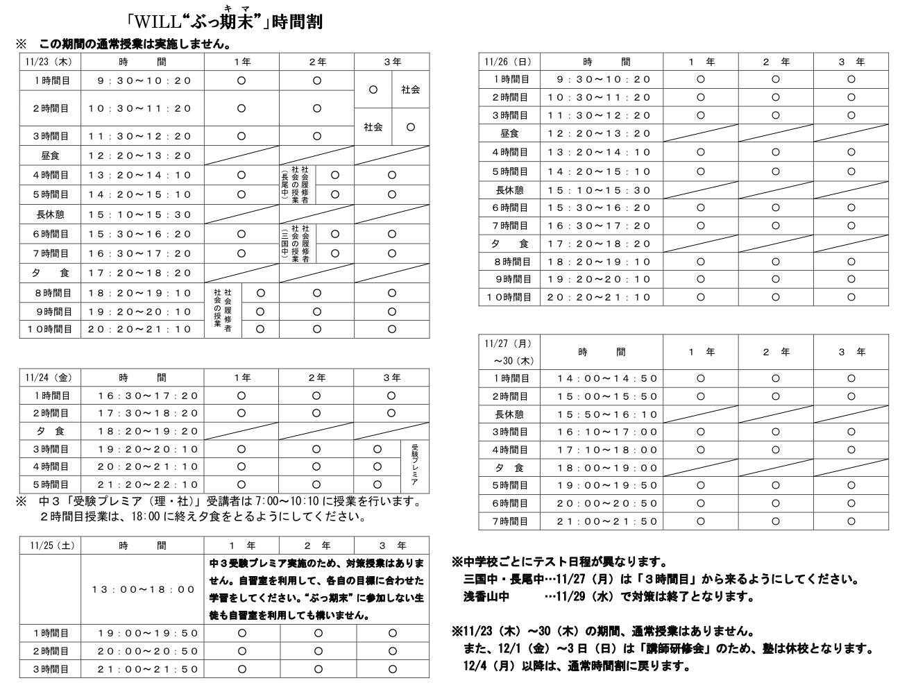 11月23日スタート! WILL教育ゼミの期末テスト対策 『ぶっとばせ!期末テスト(略称:ぶっ期末!)』 WILLは今回も「長時間の定期テスト対策」、ドカンとやります! 一人ではできない長時間の勉強も、仲間といっしょなら頑張れますし、やる気も持続します。 やらなければならないことは、WILLのプロ講師陣がピンポイントで提供します。 対策の詳細はこちらをご参照ください。 ↓ WILL教育ゼミ2学期期末テスト対策イベント 時間割についてはこちらをご参照ください。 ↓