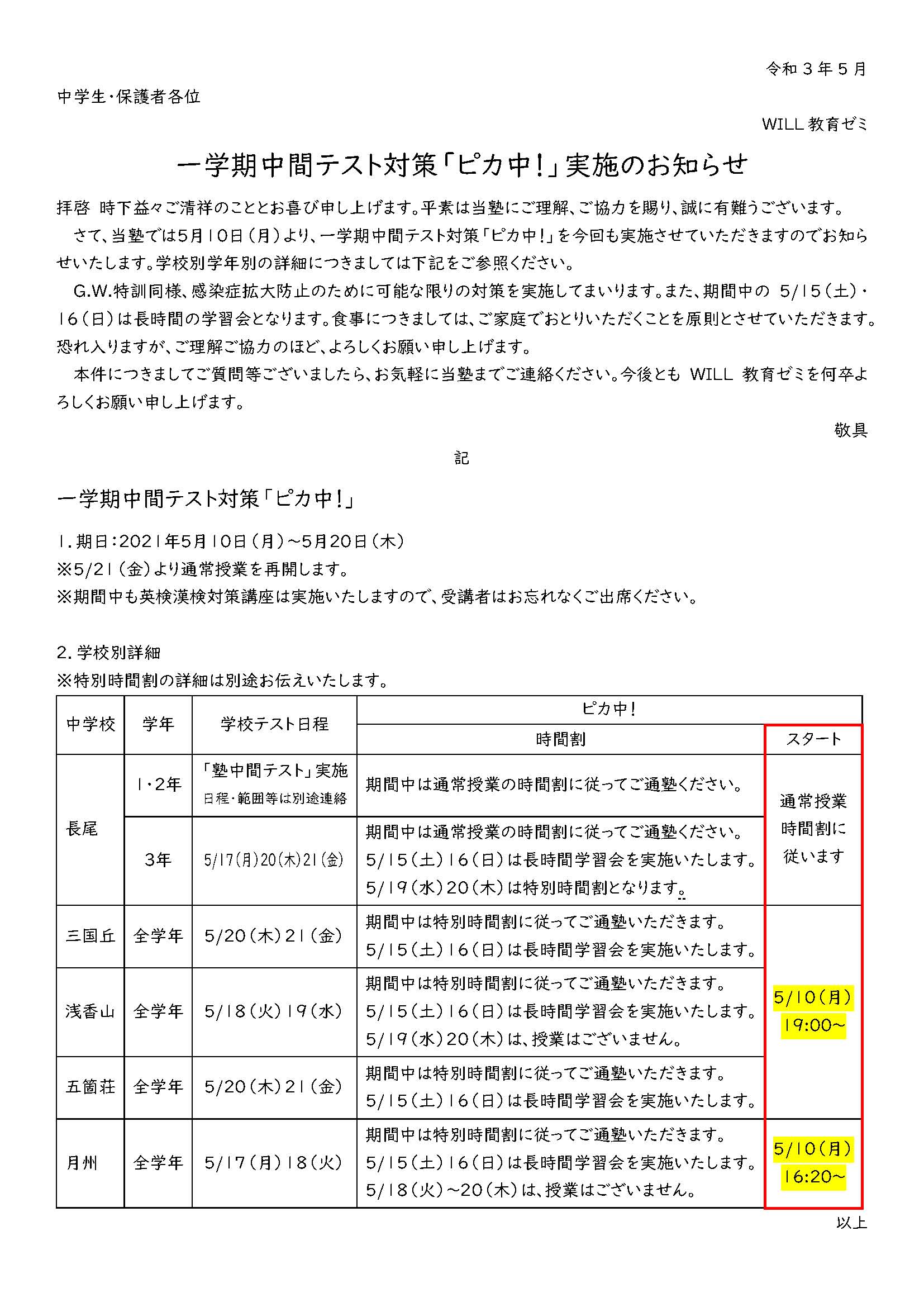 WILL教育ゼミの中間テスト対策 『★輝け!中間テストで!★(略称:ピカ中!)』 WILLは今回も「長時間の定期テスト対策」、ドカンとやります! 一人ではなかなか難しい長時間の勉強も、仲間といっしょなら頑張れますし、やる気も持続します。 何をやらなければならないかは、WILLのプロ講師陣がピンポイントで指導します。 5月10日(月)からスタート! WILLの『ピカ中!』で、新学年のスタートダッシュを決めて、自信と笑顔を手に入れよう!